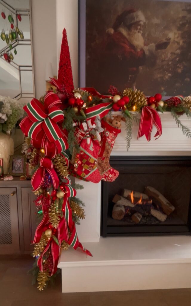 🎄Twist an additional two pieces of garland together and attach the ends of that with wire to the ends of the other twisted garland. This will complete the top of the mantle.